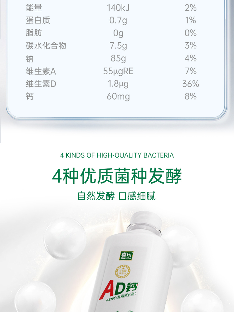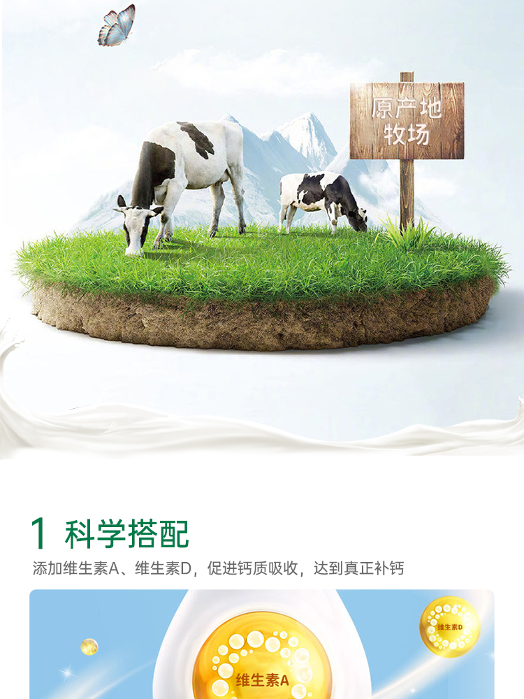 營養成分:添加維生素A(有促進生長、繁殖,維持骨骼、視力等多種生理功能)、維生素D(促進鈣、磷吸收,皮膚細胞生長分化及調節免疫功能),添加鈣