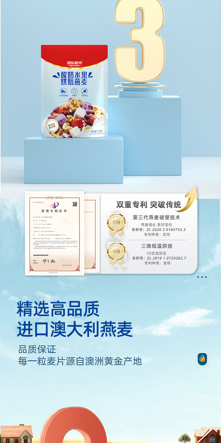 雙重專利:1. 第三代破壁專利技術,燕麥細化,更好吸收;2. 三維低溫烘焙發明專利,還原燕麥自然香脆